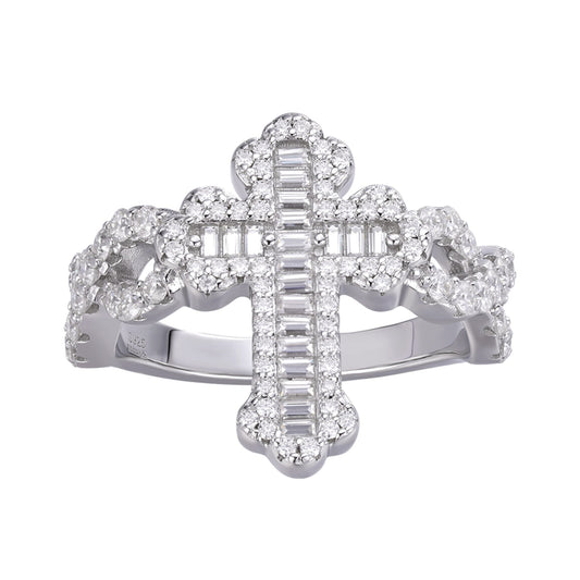 Sterling Silver Round Baguette Moissanite Cross Religious Size 9 Ring 1-5/8 Ctw