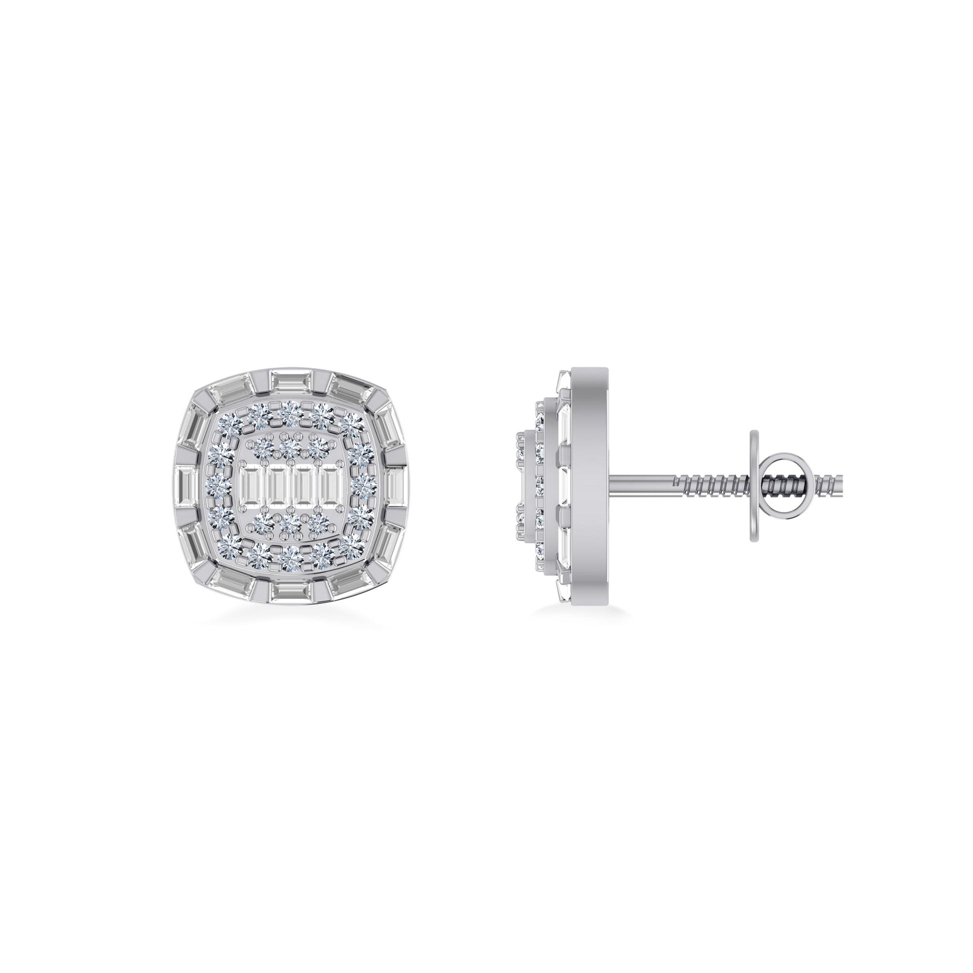 Step into the world of timeless sophistication with these square designer earrings, meticulously crafted in lustrous 10K white gold. Featuring a stunning round diamond at the center, each earring is enhanced by a sparkling array of baguette-cut diamonds, totaling 3/4 carat. The geometric square design offers a modern, clean look, while the combination of round and baguette diamonds creates a brilliant contrast that catches the light beautifully from every angle.