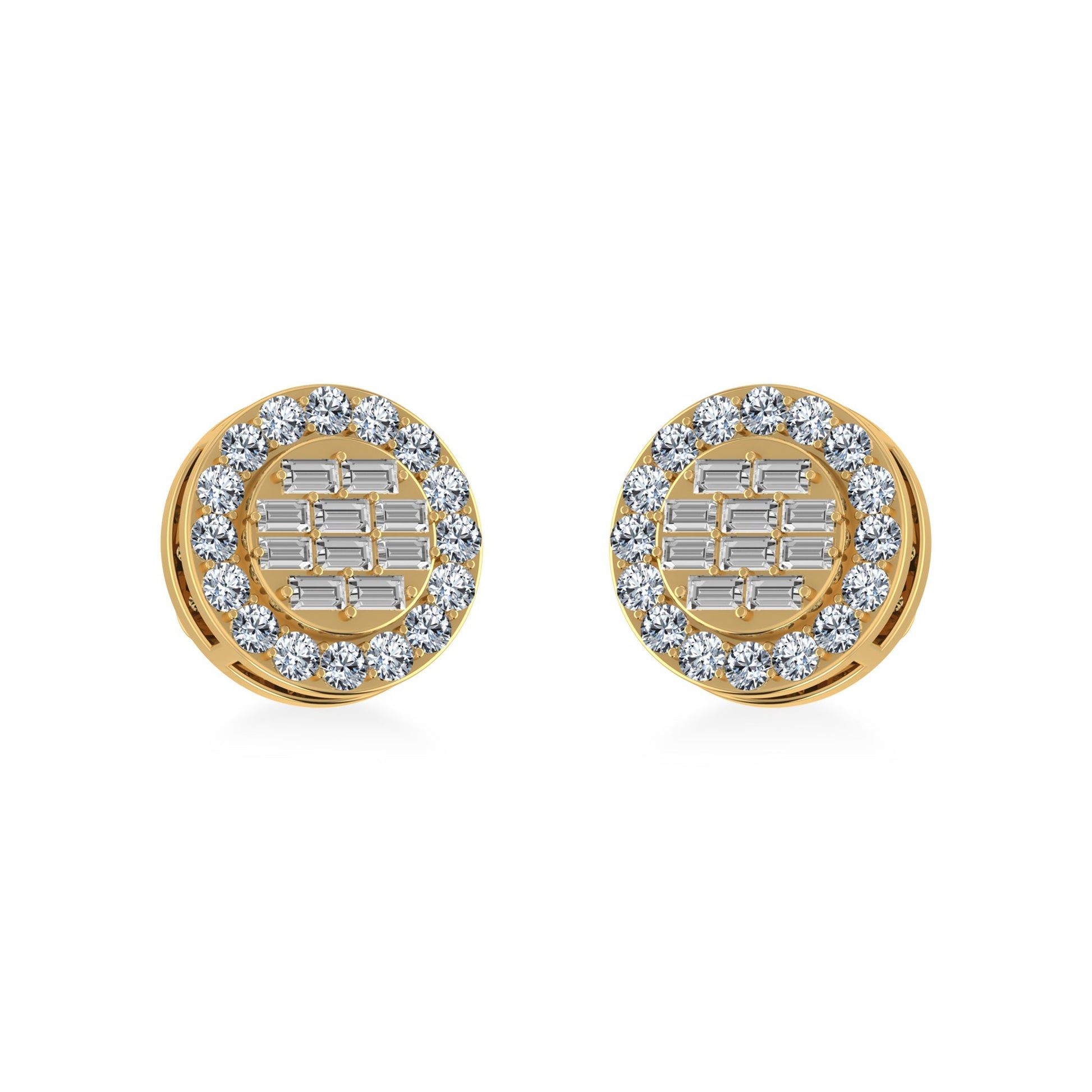 Exude sophistication and charm with these exquisite stud earrings, featuring a stunning halo design crafted from 14K yellow gold. Each earring showcases a radiant combination of round and baguette-cut diamonds, totaling 1/2 carat, set to catch the light and enhance your natural beauty.