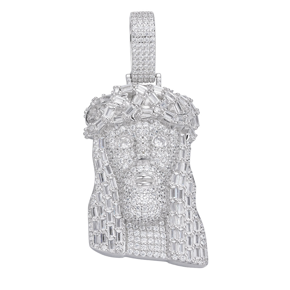 Celebrate your faith with this stunning Sterling Silver 45mm Round Baguette Moissanite Jesus Face Religious Pendant. Adorned with 8-7/8 carats of radiant Moissanite stones in round and baguette cuts, this pendant captures the powerful and timeless image of Jesus. Crafted from premium sterling silver, this piece combines spiritual significance with luxurious elegance, making it a standout addition to any collection.